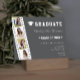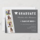Invite a los huéspedes a la fiesta de graduación de su hijo con esta moderna Invitación a la Casa Abierta de cuatro Collages de fotos de Graduación Gris. El diseño de la invitación incluye una tira de película y cuatro fotos, adornos de tapón de graduación con un guión elegante y una tipografía. Añadir fotos y detalles de la casa abierta al personalizar. El color de fondo del reverso de la invitación puede cambiarse para complementar la foto o para añadir el color de la escuela.