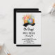 Una invitación de cumpleaños con un tema de fotografía. El texto dice Oh Snap! Con los detalles de tu fiesta personalizados. Diseñado con una ilustración de acuarela de una cámara naranja con un ramo de flores y una tira de película ondulada en blanco y negro.
