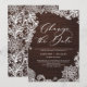 ¡Cambia la fecha! Anuncia a tu familia y amigos el aplazamiento de tu boda con esta tarjeta de anuncio de boda rústica. Cuenta con encaje antiguo floral y de follaje sobre fondo de madera falsa con patrón de encaje a juego. Personaliza añadiendo tus nombres y otros detalles. Esta tarjeta de cancelación de boda de encaje floral también será perfecta como anuncio de fuga.
