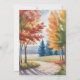 Una pintura acuarela de un paisaje otoñal con un camino de tierra serpenteando a través de árboles coloridos. Los árboles de la izquierda tienen hojas rojas y naranjas profundas, mientras que los árboles de la derecha pasan del amarillo al verde. A medio camino, un alto pino azul se alza. El camino está pintado en tonos marrones cálidos con hojas de naranja caídas diseminadas a lo largo. El fondo está formado por colinas onduladas en tonos azul y violeta. El cielo está pintado de suaves lavabos azules y blancos, creando un ambiente otoñal tranquilo. El césped a lo largo del camino se representa en varios tonos verdes y dorados. La pintura tiene un estilo suelto y expresivo típico de las técnicas acuarelas, con pinceladas visibles y sangrado de color. La composición se equilibra con los árboles que crean líneas diagonales fuertes que conducen desde el primer plano al fondo. La paleta de colores está compuesta en general por rojos, naranjas, amarillos, verdes, azules y marrones, que captan la esencia de un día de otoño.