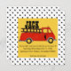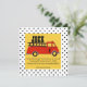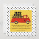 Acuarela pintada a mano de un coche de bomberos rojo del vintage brillante con su escalera negra contrapesada para modificar para requisitos particulares con el nombre del niño del cumpleaños que se sienta encima de él y la edad del muchacho del cumpleaños en la puerta del camión. El texto se presenta todo para dar los detalles específicos de la fecha, tiempo, lugar, dirección y RSVP-apenas añade su propio Info a las plantillas proporcionadas.