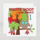 Camisetas Owl First Birthday, trajes para el cuerpo, tazas, imanes, keepsakes, posters, bolsas y más con un búho, muchos árboles y texto que dice "¡Hooty Hoot Look Whoo's 1!"