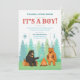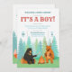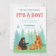 Este diseño rústico es perfecto para una ducha de bebé temática al aire libre. El diseño moderno incluye animales de bosque alrededor del fuego del campamento. ¡Personalizable.