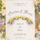 This romantic wedding design features a delicate freesia floral arch in soft freesia yellow, canary yellow, cloud dance backgorund color, and warm pastel tones, accented with gentle lavender hues and flowing botanical details.