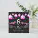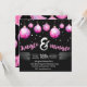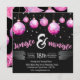 Dramático fiesta jingle y mingle negro y rosa con adornos rosas en la parte superior de la carta, colgando del borde. Las estrellas grises flotan en el fondo. La carta tiene un toque retro. El reverso de la tarjeta tiene similar color dramático y rosado. Patrón ornamento rosa con fondo negro dramático. La información sobre la invitación de las partes es totalmente personalizable. Diseñado por mw1designsart.