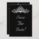 Diseño de tarjeta de boda elegante para ahorrar la fecha con un candelabro de plata altamente detallado sobre un fondo negro. Este diseño viene en varios productos de papelería para hacer un hermoso tema para toda la papelería de tu boda.
