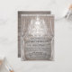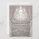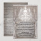 Invitaciones de boda encantadoras para granero de campo con un fondo de madera rústica, un elegante candelabro vintage, cortinas transparentes incrustadas con luces centelleantes y texto de boda moderno.