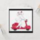 Cría blanca en una moto al estilo Vespa. Muy retro de los años 50 con un caniche de bonito vestido con un collar rojo y cabalgando la scooter rojo brillante. Diversión para fiestas para chicas.