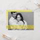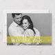 El Personalizable de Invitación de fotos de Save the Date Script capta la tarjeta de fecha con un banner amarillo transparente y un guión caligráfico caprichoso.