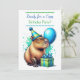 Blue and Green capybara themed boy's Birthday Party Invitations. A watercolor capybara holding a balloon and birthday gift. Cute for kids of any age!