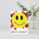 La clásica cara de deslumbramiento rodeada de globos rojos. Su información en la parte posterior.