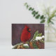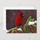 Una imagen preciosa de un cardenal de sexo masculino brillante rojo en una nieve sacó el polvo de la rama del pino completa con los pinecones.