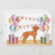 El personalizado original de Destei ilustracion de un lindo perro de raza Vizsla húngaro. El perro está situado en un colorido entorno de cumpleaños, con globos de cumpleaños de color pastel, regalos y una pancarta. Los colores pastel son rosa, verde, azul, rojo, naranja y violeta. El perro está parado en una textura de parqué amarillo y el fondo tiene un juego de puntos polka de color pastel. Personalice las áreas de texto de ejemplo con los detalles de su evento.