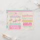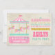 © Socialite Designs. Colorido diseño de carrusel de caballos en rosa, dorados y colores acuáticos, texto y vintage invitación de cumpleaños de fondo de papel teñido.