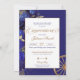 Invitación Quinceanera para un elegante ránking occidental / tema charro. Con elegantes rosas reales azules y otras flores florales y acentos dorados, ruedas de carros, gorra con sombrero y texto y una silueta de caballo en el fondo. Consulta la tienda para ver esta invitación en diferentes combinaciones de colores para que coincida con tu evento, así como más accesorios para juntar tu día