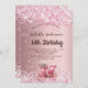 Un fondo de degradado rosa oscuro decorado con chispas falsas, confeti y una romántica carroza vintage. Personalice y agregue su nombre, edad, detalles de fiesta.