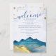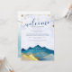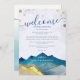Plantilla de tarjeta de invitación de carta de bienvenida y itinerario de boda elegante vintage moderno - Montañas de acuarela con lámina de oro falso y paisajes de escenarios de color azul verde.