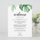 Hermosas tarjetas de bienvenida y itinerario con hojas de palma tropical en acuarela marcan el tono para tu evento tropical. Insértalas en los bolsos de bienvenida del hotel para saludar a tus invitados y hacerles saber el horario para tu gran fin de semana. Son perfectas para una boda en la playa o en un destino, una ducha, fiesta en la playa, fiesta de verano o evento corporativo tiki. Explora toda la colección en mi tienda de Zazzle. Personaliza o edita más haciendo clic en el enlace "personalizar más" y utiliza la herramienta de diseño para modificar esta plantilla. Todo el estilo de texto, colores y tamaños pueden ser modificados para ajustarse a tus necesidades. ¿Necesitas ayuda para personalizar? ¡Envíame un mensaje!