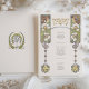 Impresione a sus huéspedes con esta exquisita carta de cocina Boda de estilo Art Nouveau. El frente presenta un impresionante diseño con intrincados patrones florales y elegantes perfiles femeninos en ricos tonos tierra de tonos verdes, dorados y pastel. Los detalles decorativos encuadran la selección de menús, añadiendo un toque de elegancia eterna a la recepción de tu boda. En la parte trasera hay un emblema floral refinado, perfecto para realzar el encanto vintage de su día especial. Ideal para los bodas con temática vintage, esta carta es una manera sofisticada de presentar sus aperitivos, platos y postres.