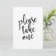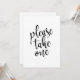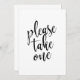 Un elegante cartel de boda de vanguardia, con el texto 'Por favor tome uno' en una fuente de escritura extrovertida, la textura de pincel añade un sentimiento espontáneo y juguetón. El color de fondo se puede personalizar según tus necesidades y preferencias, por favor contacta conmigo si tienes alguna petición especial.