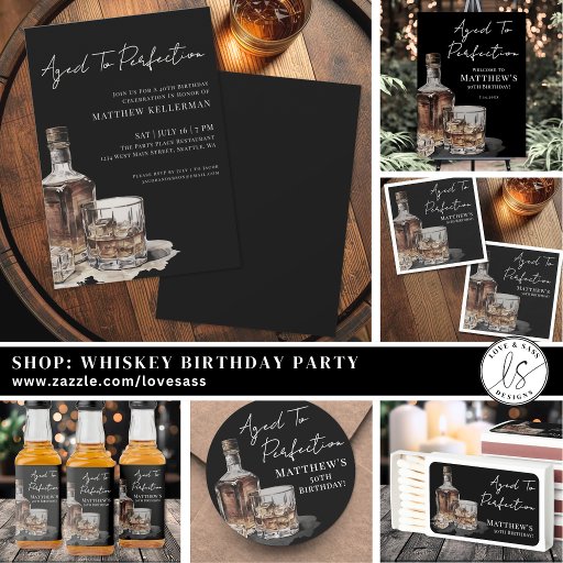 Letrero de cumpleaños mini Envejecido a la Perfección. Este diseño refinado con tema de whisky presenta una mezcla de escritura a mano rústica y fuentes serif clásicas para un aspecto cálido y pulido. "Envejecido a la perfección" aparece en la parte superior en una elegante combinación de los dos estilos de fuente, seguido del nombre y la edad de la persona que cumple años para un toque personal. Una botella de whisky y un vaso de acuarela en negrita se sientan en el lado izquierdo, lo que agrega un toque moderno. El fondo negro mantiene el diseño limpio y llamativo. Perfecto para cumpleaños importantes y totalmente personalizable para cualquier edad.