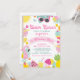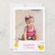 Pancarta rosa de la foto Retro Splish Splash Invitación a los primeros cumpleaños Colorida piscina o playa invitación a la fiesta de primer cumpleaños para una bebé con un flotador de pato rosa, sol amarillo, helado, bebidas tropicales, texto de estilo retro, pancarta rosa y una foto en la parte de atrás. Esta colorida invitación al primer cumpleaños con temática veraniega es una forma muy agradable de preparar la escena para una fiesta de primer cumpleaños de un chica.