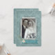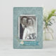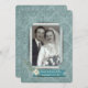 Casa abierta para cualquier año de aniversario de bodas con marco de foto personalizado de la pareja. El fondo es damasco de color teal brillante con marco de esquina y ramo de flores.