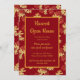Invitación a Casa Abierta de Cosecha, con acentos de follaje otoñal rojo y dorado. Con un fondo rojo oscuro y letras doradas, puedes personalizar con tu propia información. Con un menú de muestra en el reverso, puedes informar a tus invitados el menú que sirves.