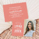 Celebre a su estudiante de último año con una invitación moderna de graduación de coral que presenta un icono de gorra limpia, nombre en negrita estilo universitario y diseño de la promoción de 2026 junto con una gran foto. Personalice el nombre, la escuela, el año, los detalles de la fiesta y la confirmación de asistencia. La parte posterior incluye el titular “Celebremos al graduado” con los detalles de la casa abierta correspondientes.