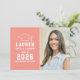 Celebre a su graduado con una invitación de fiesta de graduación de coral moderno que presenta un icono de gorra limpia, nombre audaz de estilo universitario y diseño de la promoción de 2026 junto con una gran foto. Personalice el nombre, la escuela, el año, los detalles de la fiesta y la confirmación de asistencia. La parte posterior incluye el titular “Celebremos al graduado” con los detalles de la casa abierta coordinados.