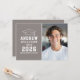 Invitación de fiesta de graduación moderna con un bloque de color taupe limpio, icono de gorra y tipografía varsity en negrita. Personalice con la foto del graduado, nombre, año de graduación y escuela. La parte trasera presenta un diseño taupe coordinado para detalles de la casa abierta como fecha, hora, ubicación y RSVP.