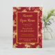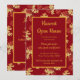 Invitación a casa abierta de cosecha, con acentos de follaje otoñal rojo y dorado. Con un fondo rojo oscuro y letras doradas, puede personalizar con su propia información. Con un menú de muestra en el reverso, puede informar a sus invitados el menú que está sirviendo.
