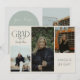 Anuncio de graduación boho con arco moderno y tarjeta de invitación a casa abierta con fotos en la parte posterior. Si se desea, se puede agregar texto en la parte trasera de la tarjeta para más información sobre la educación o la fiesta de casa abierta