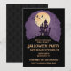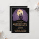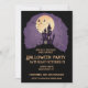 Una invitación gótica de Halloween que presenta la silueta de una casa embrujada contra una luna llena brillante con murciélagos y árboles siniestros. Diseñado en tonos sombríos púrpura y negro, este dramático arte establece el tono perfecto para las fiestas de Halloween. Personalice con los detalles de su evento para crear una invitación memorable.