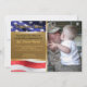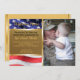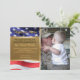 El oro y la foto militar de la bandera patriótica van de fiesta la foto vertical de encargo de las invitaciones del soldado o del miembro militar en el derecho. El fondo a la izquierda se confina en la parte superior e inferior con la foto de los E.E.U.U. señale a las barras y estrellas por medio de una bandera. Se centra el fondo metálico del falso oro asperjado con el pedazo del purpurina del oro para una mirada festiva. Lee el hogar agradable en el top. Debajo de él lee "se unen a o acogen con satisfacción por favor la celebración del héroe casero para" en negro con la fila y el nombre personalizados abajo en la información del fiesta del hogar de la escritura y de la recepción del color oro abajo en oro a juego. La cinta vertical de la mirada del oro en el centro separa las dos mitades. La parte posterior tiene hacer juego, el fondo sólido del color oro y fronteras metálicas de la cinta de la mirada del oro. Nota: Se imprimen todas las imágenes. Purpurina o metal no real. Los militares caseros elegantes, agradables van de fiesta invitaciones. Haga clic la opción del personalizar para cambiar colores de texto, tamaño, y estilos de fuente. Visite nuestra tienda en línea de Zazzle.com/angela65 para invitaciones personalizadas de la foto.