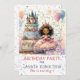 Creado en una atmósfera abstracta caprichosa y encantadora, esta tarjeta de invitación personalizada presenta a una linda princesa afroamericana con corona, celebrando su cumpleaños con pastel de castillo, salpicadura de confeti en hermosos colores pastel.