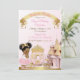 Dulce princesa con su corona y su carruaje frente a su castillo. Hecho en rosa y oro. Uso para cumpleaños, duchas para bebés o invitaciones.