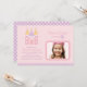 Organice una celebración real con esta dulce invitación de cumpleaños con foto del castillo de la princesa en formato horizontal. Un encantador castillo rosa ilustrado se encuentra junto a un marco de foto con borde ondulado sobre un fondo rosa suave, con "[Nombre] la Princesa cumple [edad]" y "Celebración Real" en letra script y de imprenta coordinadas. Los acentos a rayas lavanda y rosa bordean la parte inferior, y la parte posterior presenta un patrón de lunares lavanda y blanco. Todo el texto es totalmente personalizable.