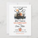 Las invitaciones a la fiesta Best Costume Halloween incluyen Casle Inchanted con murciélagos espeluznantes. Texto personalizado en naranja y negro.