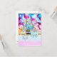 It's a colorful and vibrant Christmas card design depicting a cactus decorated with string lights and a suspicious-looking kitty against a starry background with snow falling from the sky.