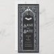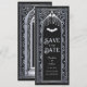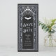Descubre tu oscuro romanticismo con esta catedral gótica de vampiros ¡Salve las tarjetas de fecha! Con un intrincado diseño negro y plateado, estas tarjetas marcan el tono para un boda tan atemporal como su amor. Artículos coincidentes en nuestra tienda para un tema fiesta completo. Tenga en cuenta que la plata en las etiquetas NO es un Relieve metalizado real y está impresa en colores planos