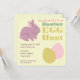 Una invitación a la caza de huevos en Pascua que incluye el ilustracion de un conejito morado en la parte superior izquierda y huevos rosas y amarillos de Pascua en la parte inferior derecha. Personaliza el texto con detalles de tu ocasión.