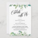 Usando una fuente de escritura moderna y elegante con giros, he creado una superposición gráfica que dice "Celebra con Nosotros", para complementar la sofisticada fuente serif de mayúsculas utilizada para tus detalles. El texto está acentuado por rociadas de vegetación de eucalipto en acuarela. Todas las capas se agregaron por separado y se dejaron desbloqueadas para darte un control significativo sobre el diseño; haz las modificaciones necesarias para crear la tarjeta que imaginas. // 119 //