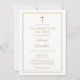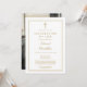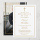 Una invitación de funeral cristiana moderna y elegante con borde dorado para una Celebración de Vida con una foto en el reverso. Diseñada por Thisisnotme©