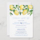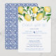 Invitaciones de fiesta posterior a la boda 'celebra con nosotros' con vibrantes limones acuarela y hojas verdes brillantes con hermosas flores, complementadas con azulejos azules cobalto y blanco en el reverso.