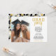 Si estás teniendo una fiesta de graduación de grupo este año — o graduación conjunta, esta invitación y invitación tiene 1 foto y espacio para al menos 4 nombres. La parte trasera de la invitación tiene un patrón moderno de media luna. Añade cualquier año para mostrar este diseño elegante y de moda. Esto se puede usar para cualquier graduado - escuela secundaria, universidad, escuela de posgrado, escuela de medicina o incluso escuela de comercio.