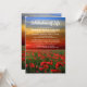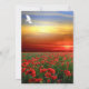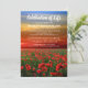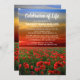 Invitación al servicio conmemorativo que incluye un hermoso campo de amapola, una puesta de sol elegante, una paloma tomando vuelo y una celebración de la plantilla de vida que es fácil de personalizar.