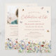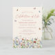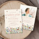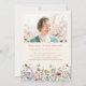 Esta es una tarjeta de invitación para un funeral moderno y caprichoso para celebrar la vida de su ser querido. El diseño presenta una hermosa fuente de caligrafía y hermosas flores silvestres en tonos pastel rosa, púrpura, azul, amarillo y rojo terracota, así como delicadas mariposas revoloteando. Esta invitación de celebración de la vida se puede personalizar fácilmente con su propia foto y texto para crear un tributo especial para el funeral, memorial o celebración de la vida de su ser querido utilizando la plantilla proporcionada.