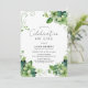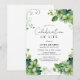 Invitación elegante de celebración de la vida del trébol shamrock. El diseño presenta un fondo blanco clásico decorado con tréboles de acuarela verde botánica. La plantilla es fácil de personalizar con los detalles de su funeral o servicio conmemorativo.