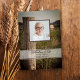 Invite a sus huéspedes a recordar a su ser querido después de su paso con la encantadora invitación a la granja Wooden Fence Post. El servicio funerario temático de este rancho de personalizados de moda rural o tributo a la muerte incluye una fotografía rústica de una granja de un puesto de alambre de púas de madera con un balé de heno redondo y pastos verdes al fondo. Disponible en forma de invitación impresa para correo y/o como descarga digital para compartirla digitalmente. Inspo o idea única para una vaquera, vaquero, ecuestre o agricultor.